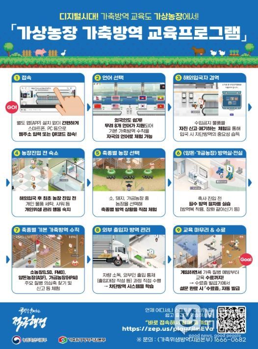 '가상농장(Virtual Farm) 가축방역 교육프로그램'은 외국인 근로자와 신규 진입 축산농장주 등이 축산농장 내에서 반드시 지켜야 할 방역 수칙을 교육하기 위해 개발된 온라인 교육 프로그램으로 지난 2025년 2월부터 12월까지 1~2차 시범운영을 거쳐 올해 정식 운영으로 전환한다.