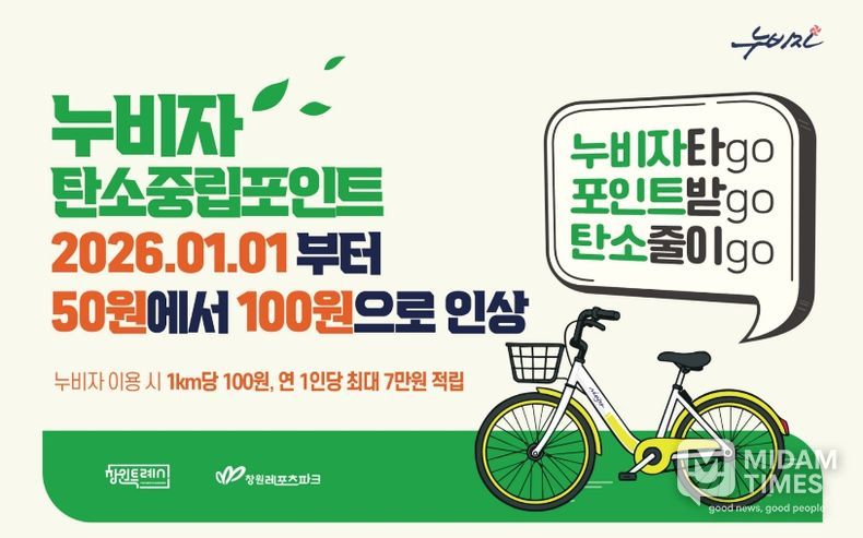 미담타임스 김준완 기자 | 창원특례시는 공영자전거 “누비자” 이용 시민에게 지급하는 탄소중립포인트 인센티브가 2026년 1월 1일부터 1km당 50원에서 100원으로 인상된다고 밝혔다.