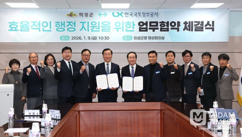 미담타임스 김준완 기자 | 의성군은 9일 군청 본관 2층 영상회의실에서 LX한국국토정보공사(사장 어명소)와 ‘효율적인 행정지원을 위한 업무협약’을 체결했다고 밝혔다.