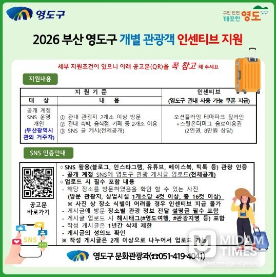 미담타임스 김교환 기자 | 부산시 영도구는 개별 관광객의 자발적인 온라인 홍보를 유도하고 지역 소비를 활성화하기 위해 ‘2026년 개별 관광객 인센티브 지원사업’을 본격 추진한다고 밝혔다.