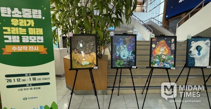 미담타임스 김교환 기자 | 창원특례시는 미래세대의 눈으로 바라본 기후적응과 회복 메시지를 시민과 공유하기 위해 ‘탄소중립, 우리가 그리는 미래’ 그림 공모전 수상작을 1월 12일부터 16일까지 시청 현관 1층 로비에서 전시한다고 밝혔다.