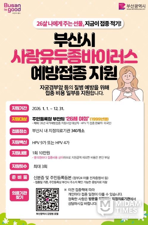 미담타임스 김교환 기자 | 영도구보건소는 사람유두종바이러스(HPV) 감염으로 인한 자궁경부암 등 주요 질환을 예방하기 위해 2026년 26세 여성을 대상으로 사람유두종바이러스(HPV) 예방접종 비용 일부를 지원하는 사업을 시행한다.