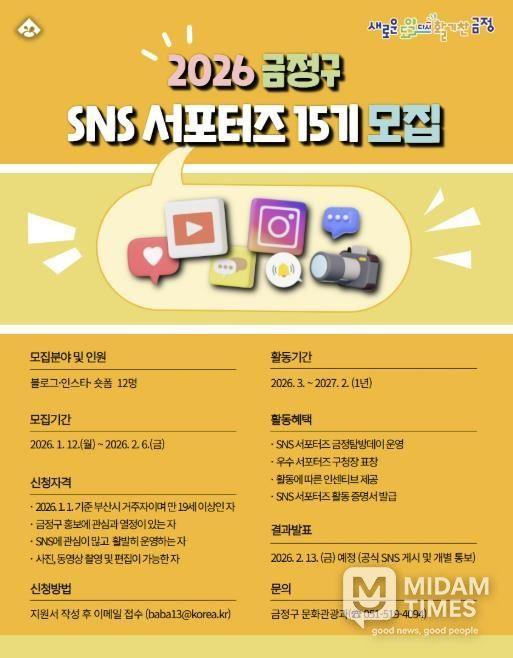 금정구는 오는 2월 6일까지 3개 분야(블로그, 인스타, 숏폼) SNS 서포터즈를 선발할 계획이라고 밝혔다.