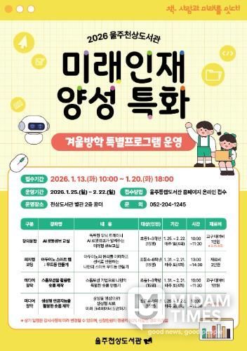 미담타임스 김준완 기자 | 울주천상도서관이 겨울방학을 맞아 오는 25일부터 다음달 22일까지 초등학생을 대상으로 ‘미래인재 양성 특화, 겨울방학 특별프로그램’을 운영한다고 13일 밝혔다.