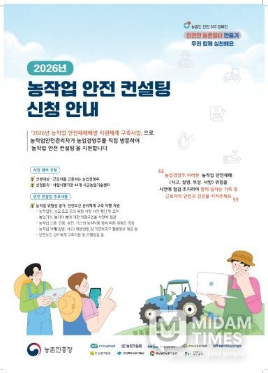 김영혁 농업기술센터 소장은 “농작업 안전사고는 사전 점검과 작은 환경 개선만으로도 충분히 예방할 수 있다”며 “이번 컨설팅이 농업인들이 보다 안전하고 건강하게 농사일을 이어가는 데 실질적인 도움이 되길 바란다”고 말했다.