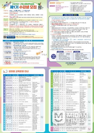 미담타임스 김준완 기자 | 구미시는 1월 19일부터 23일까지 구미시 통합예약 포털을 통해 2026년 제1기 정기과정 수강생 1,650명을 모집한다. 이번 정기과정은 2월 23일부터 5월 15일까지 5개 과정 69개 강좌가 12주 동안 운영된다.