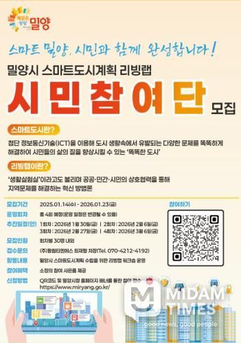 미담타임스 김교환 기자 | 경남 밀양시는 지역 내 다양한 도시문제 해결을 위한 ‘밀양시 스마트도시 리빙랩 시민참여단’을 1월 23일까지 모집한다고 밝혔다.