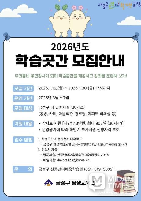 미담타임스 김교환 기자 | 부산시 금정구는 구민의 근거리 학습권 보장과 평생학습 기회 확대를 위해 지역 내 유휴시설을 대상으로 1월 19일부터 1월 30일(17시)까지 학습곳간을 모집한다.