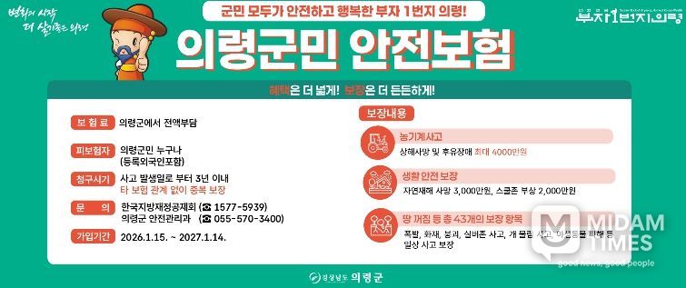미담타임스 김교환 기자 | 의령군은 일상생활 중 예기치 못한 재난과 사고로부터 군민의 생활 안정을 지원하기 위해 ‘2026년 군민안전보험’에 갱신 가입하고, 1월 15일부터 본격 운영에 들어간다고 밝혔다.