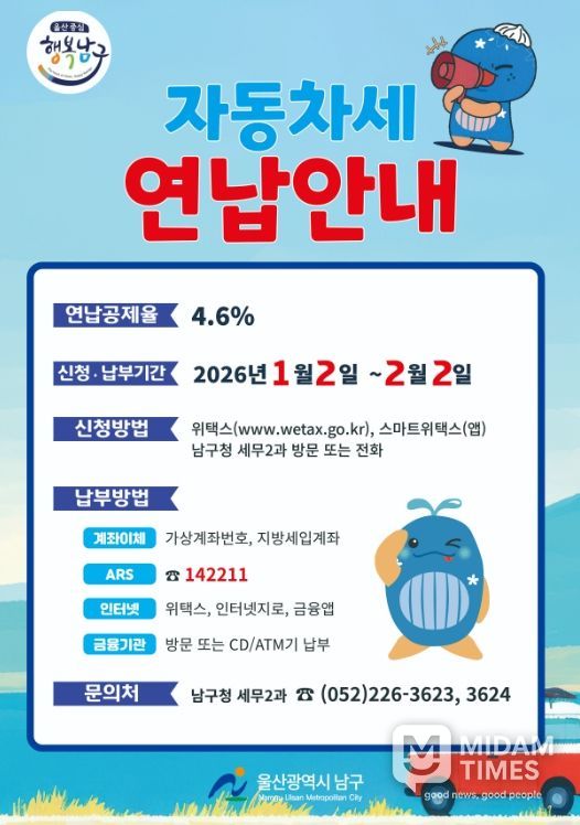 미담타임스 김준완 기자 | 울산 남구는 오는 2월 2일까지 올해 1월 자동차세 연납 신청을 접수한다고 밝혔다.