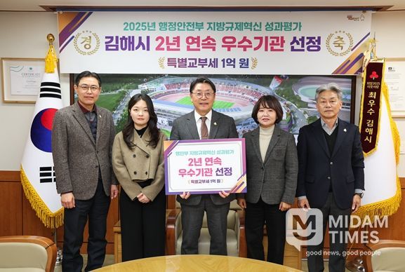 미담타임스 김교환 기자 | 김해시는 행정안전부 주관 ‘2025년 지방규제혁신 추진 성과평가’에서 2024년에 이어 2년 연속 우수기관으로 선정돼 특별교부세 1억 원을 확보했다고 15일 밝혔다.