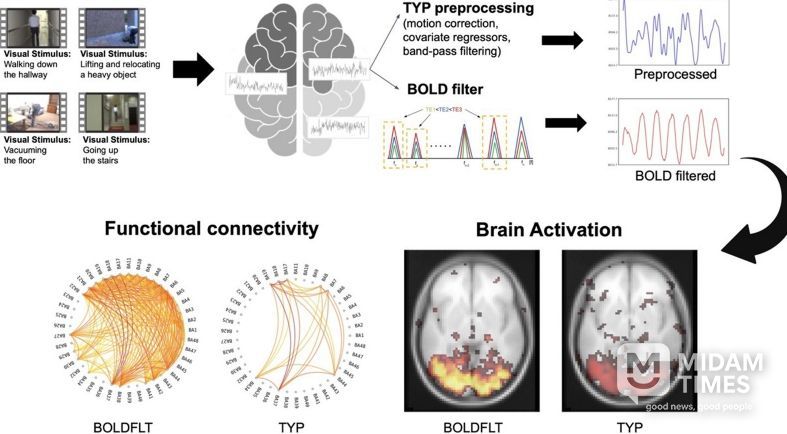 휴지기 fMRI에서 신뢰도 높은 BOLD(blood oxygenation level-dependent) 신호만 추출하던 BOLD-filter 기법을 과제기반 fMRI 전처리에 적용, 유의미한 BOLD 신호를 강조하고 잡음을 줄였다.