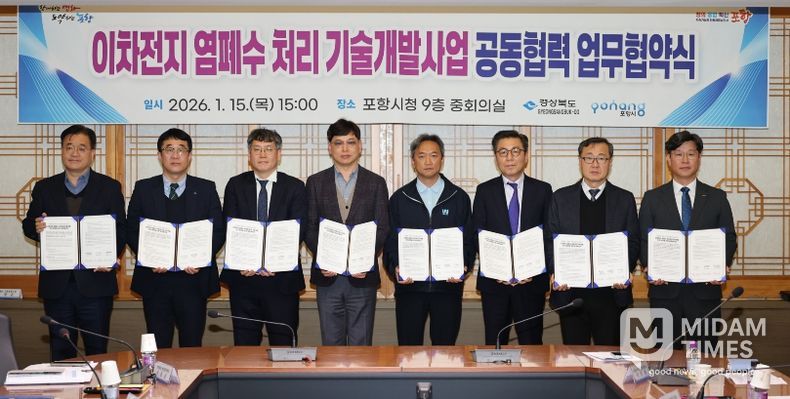 미담타임스 김준완 기자 | 경상북도는 15일 포항시청 중회의실에서 이차전지 산업의 난제로 꼽히는 염폐수 처리 기술개발을 위한 업무협약(MOU)을 체결했다.