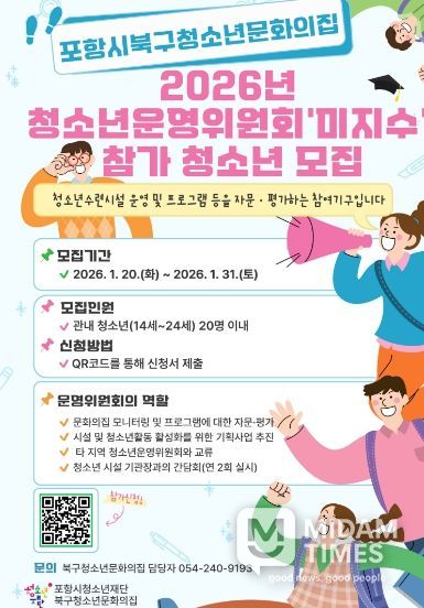 미담타임스 김준완 기자 | 포항시청소년재단 북구청소년문화의집은 오는 20일부터 31일까지 청소년운영위원회 ‘미지수’ 참가 청소년을 모집한다.