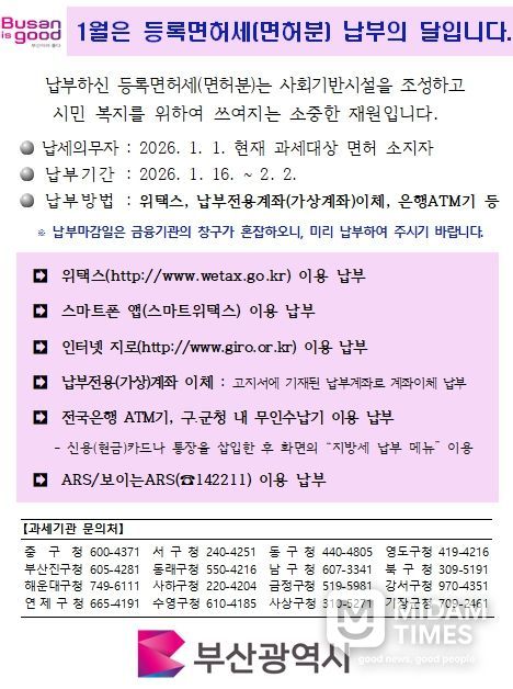 미담타임스 김교환 기자 | 부산시는 2026년 정기분 등록면허세(면허분) 총 43만여 건, 142억 원을 부과했다고 밝혔다.