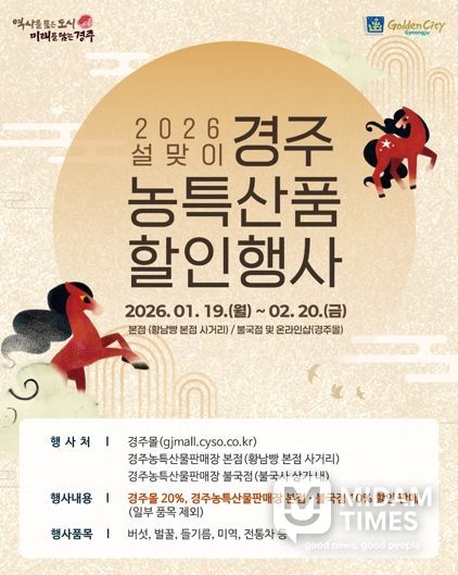 미담타임스 김준완 기자 | 경주시는 2026년 병오년 설을 맞아 1월 19일부터 2월 20일까지 ‘경주농특산물판매장 설맞이 특별할인 행사’를 진행한다고 18일 밝혔다.