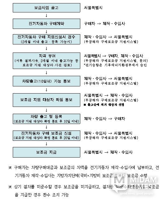 구매희망자는 자동차 제작·수입사와 계약을 체결하고, 제작·수입사가 서울시에 보조금을 신청하면 출고·등록 순으로 지원 대상자가 선정된다. 보조금은 차량 출고 및 등록 후 서울시가 제작·수입사에 직접 지급하며, 구매자는 보조금을 제외한 금액만 납부하면 된다.