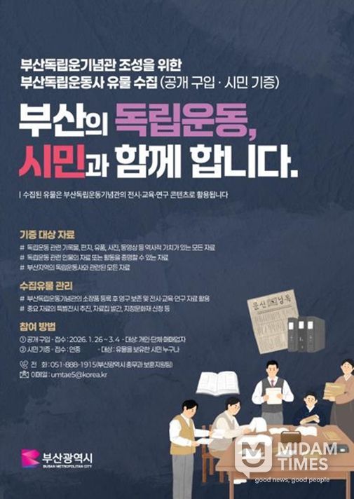 미담타임스 김교환 기자 | 부산시는 2027년 상반기 개관을 목표로 조성 중인 부산독립운동기념관의 전시·연구·교육 콘텐츠를 완성하기 위해, 부산 독립운동사 관련 유물 수집을 추진한다고 밝혔다.