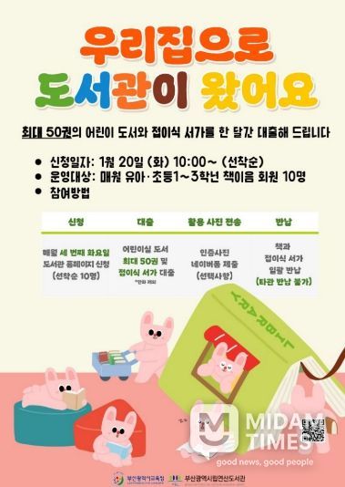 ‘우리집으로 도서관이 왔어요’는 유아와 초등학교 저학년(1~3학년)을 대상으로 매달 10명을 모집해 어린이 자료 50권과 접이식 서가를 한 달간 대출해주는 프로그램이다. 참여 신청은 매월 세 번째 화요일 부산광역시교육청 통합예약포털을 통해 접수할 수 있다.
