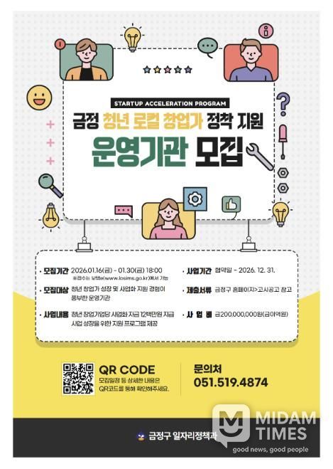 미담타임스 김교환 기자 | 부산 금정구는 지역에 정착할 수 있는 청년 로컬 창업가를 육성하기 위해 ‘금정 청년 로컬 창업가 정착 지원’ 사업을 추진하고, 이를 운영할 운영기관(보조사업자)을 공개 모집한다고 밝혔다.