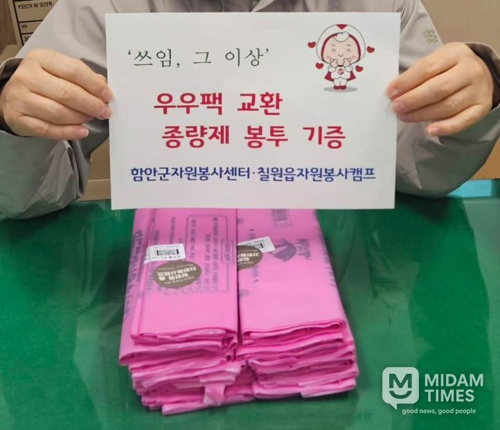 미담타임스 김준완 기자 | 함안군은 칠원읍자원봉사캠프가 우유팩 수거 활동으로 마련한 종량제봉투 약 1000매를 지난 15일 함안군외국인주민통합지원센터와 지역아동센터, 차상위계층 가정 등에 전달했다고 밝혔다.