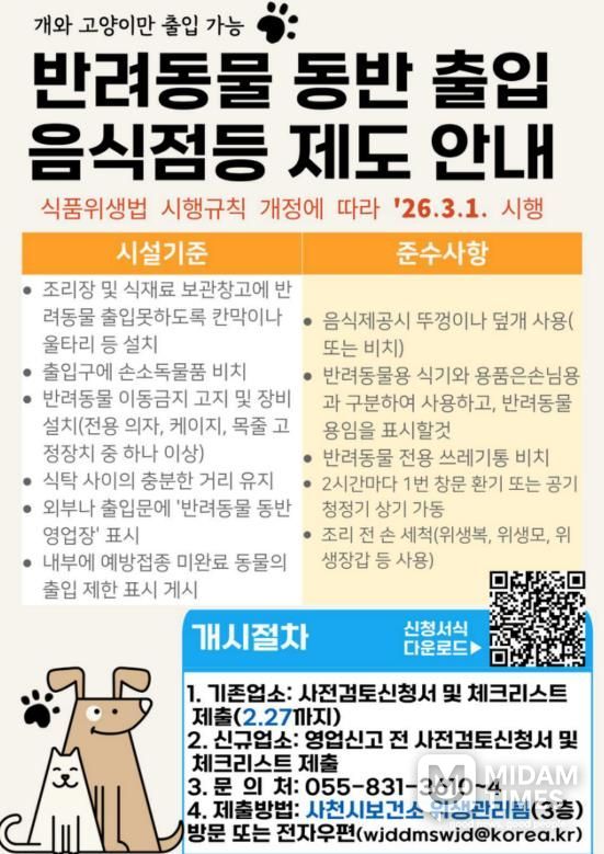 미담타임스 김준완 기자 | 사천시는 지역 내 일반음식점·휴게음식점·제과점을 대상으로 반려동물 동반 출입 음식점을 신청받아 운영할 예정이다.