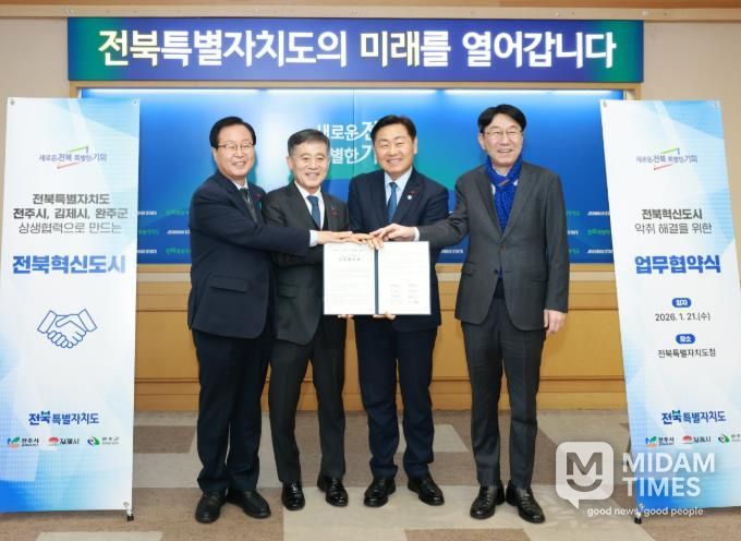 미담타임스 정인화 기자 | 완주군이 21일 전북특별자치도청에서 전북특별자치도, 전주시, 김제시와 함께 혁신도시 악취 문제 해결을 위한 업무협약을 체결했다.