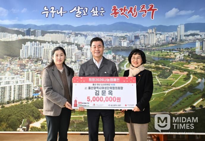 미담타임스 김준완 기자 | 울산 제93호 아너소사이어티 회원인 김문옥 씨가 1월 21일 오전 10시 30분 중구청 구청장실을 찾아 울산사회복지공동모금회를 통해 이웃돕기 후원금 500만 원을 전달했다.
