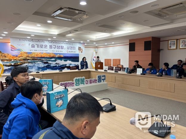 미담타임스 김준완 기자 | 울산 동구는 1월 21일 오후 2시 동구청 2층 상황실에서 신규 입국한 태국 국적 외국인 근로자 21명을 대상으로 지역 정착을 돕기 위한 ‘슬기로운 동구 생활’ 설명회를 진행했다.