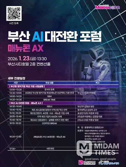 미담타임스 김교환 기자 | 부산시는 23일 오후 1시 30분 연제구 부산시티호텔 2층 컨벤션홀에서 (재)부산테크노파크 주관으로 '2026 부산형 앵커기업 육성 지원사업 설명회 및 부산 AI대전환 포럼 – 매뉴콘 AX'를 개최한다고 밝혔다.