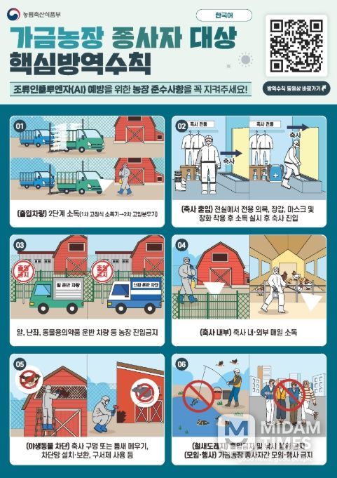 정창근 동물방역과장은 “올겨울 고병원성 조류인플루엔자가 급격하게 전국적으로 확산되고 있는 만큼, 외국인 근로자 방역관리를 포함한 기본 방역수칙 준수가 무엇보다 중요하다”며 “축산농가의 적극적인 협조를 당부한다”고 말했다.