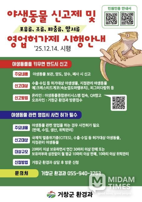 미담타임스 김교환 기자 | 거창군은 체계적인 야생동물 관리와 책임 강화를 위해'야생동물 신고제 및 영업허가제'를 본격 시행한다.