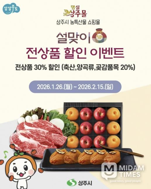 미담타임스 김준완 기자 | 상주시 농특산물 온라인 쇼핑몰 ‘명실상주몰’이 설 명절을 맞아 오는 1월 26일부터 2월 15일까지 전상품 할인 이벤트를 진행한다.