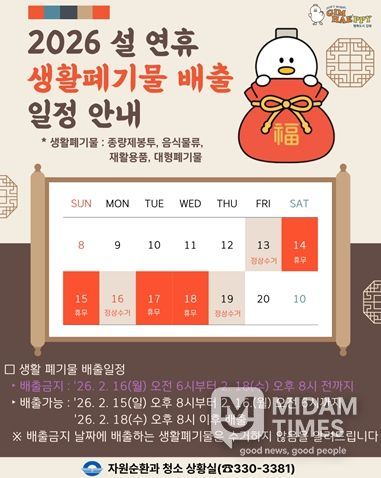 미담타임스 김준완 기자 | 김해시는 다가오는 설 연휴 기간 시민과 귀성객이 쾌적한 환경에서 명절을 보낼 수 있도록 생활폐기물 처리 대책을 시행한다고 26일 밝혔다.