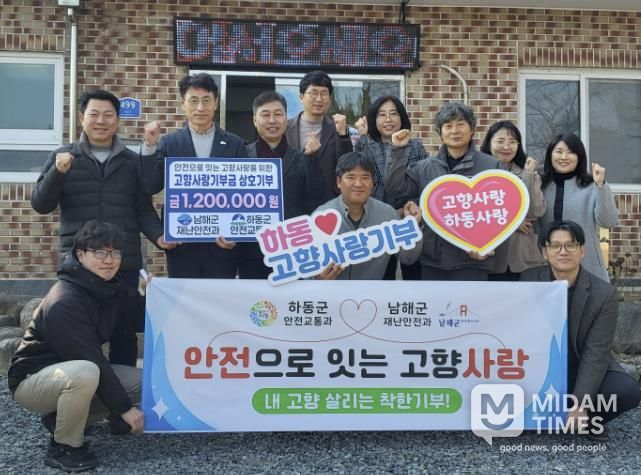 미담타임스 김교환 기자 | 남해군 재난안전과와 하동군 안전교통과는 “안전으로 잇는 고향사랑” 실천을 위해 23일 고향사랑기부금 상호기부 행사를 실시햇다. 양 기관 직원들은 각각 120만 원씩을 서로의 지역에 기부하며, 지역 상생과 따뜻한 나눔문화 확산에 앞장섰다.