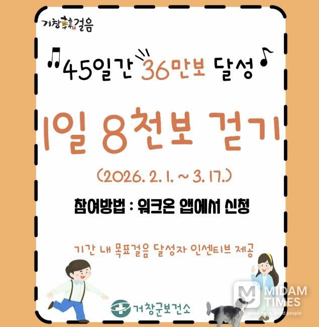 미담타임스 김교환 기자 | 거창군은 오는 2월 1일부터 3월 17일까지 거창군민을 대상으로 신체활동 증진과 생활 속 걷기 실천 활성화를 위해 '거창韓걸음'1차 챌린지를 운영한다.