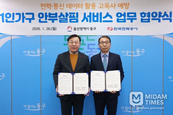 미담타임스 김준완 기자 | 울산 동구는 1월 26일 오후 3시 30분 ‘1인가구 안부살핌 서비스’ 사업 추진을 위해 한국전력공사와 업무 협약을 체결했다.