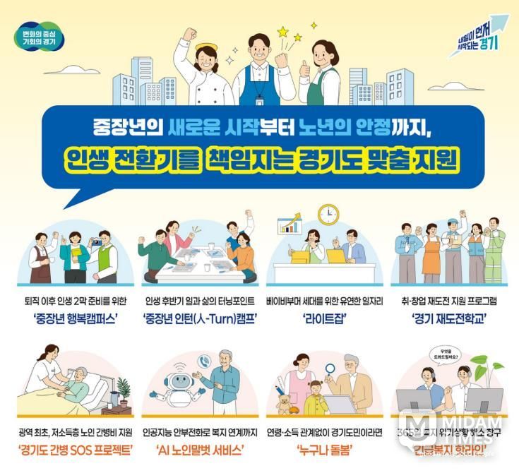 미담타임스 정주환 기자 | 퇴직 이후의 삶을 어떻게 꾸려야 할지 고민하는 중장년부터, 간병과 돌봄 문제로 어려움을 겪는 어르신과 가족까지. 경기도는 올해도 도민이 인생의 전환기에서 새로운 기회를 얻고 안정적으로 생활할 수 있도록 맞춤형 정책을 계속해 나간다.