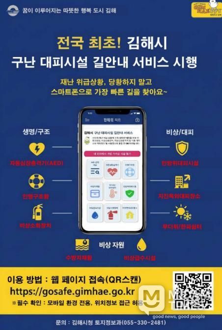 미담타임스 김교환 기자 | 김해시는 전국 최초로 시민이 위급상황에 신속히 대응할 수 있도록 ‘구난 대피시설 길안내 웹페이지’를 자체 구축해 서비스한다고 27일 밝혔다.