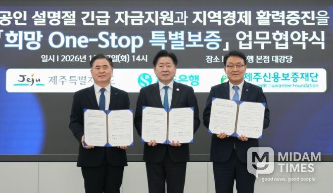 제주도는 27일 제주은행 본점에서 제주은행, 제주신용보증재단과 함께 소상공인 설명절 긴급 자금지원과 지역경제 활력 증진을 위한 ‘희망 원스톱(One-Stop) 특별보증’ 업무협약을 체결했다.
