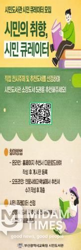 미담타임스 김교환 기자 | 부산광역시립시민도서관은 오는 3월부터 12월까지 이용자가 직접 도서를 추천하고 전시에 참여하는 북큐레이션 프로그램 ‘시민의 취향, 시민 큐레이터’를 운영한다.