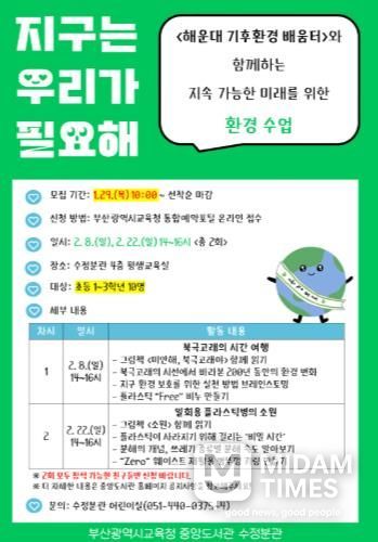 미담타임스 김교환 기자 | 부산광역시립중앙도서관은 다음달 8일과 22일 수정분관에서 초등학교 1~3학년 10명을 대상으로 환경 책 놀이 프로그램 ‘지구는 우리가 필요해’를 운영한다.