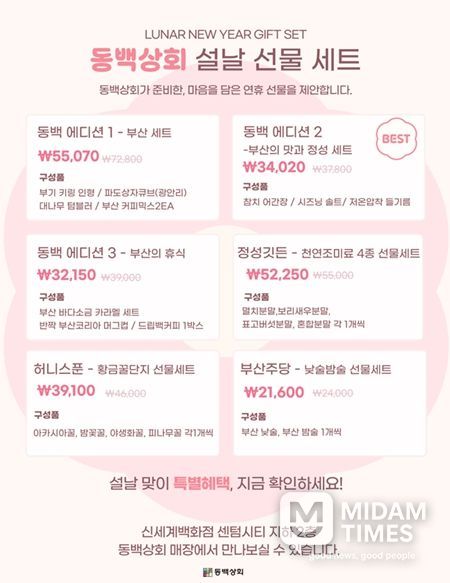 미담타임스 김교환 기자 | 부산시와 부산경제진흥원은 부산 우수 제품 쇼핑 숍 '동백상회'에서 설 명절을 앞두고 지역기업 제품으로 구성된 '선물 세트'를 출시하고, 동백상회 제품 구매 고객 대상 사은품 증정 행사를 진행한다고 밝혔다.
