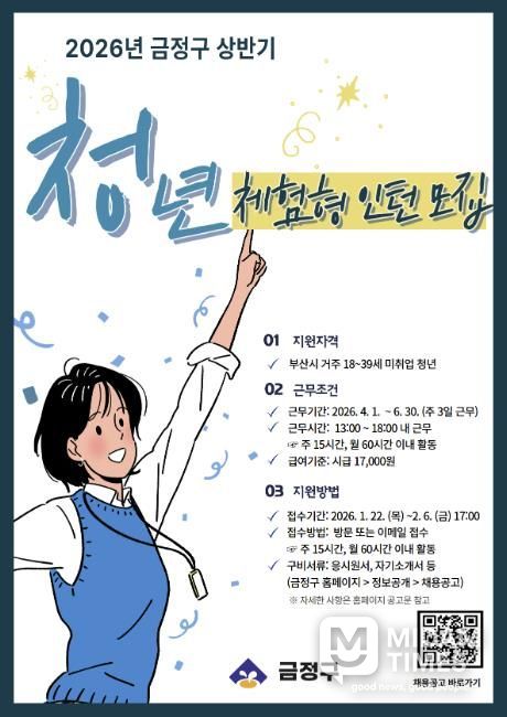 미담타임스 김교환 기자 | 부산 금정구는 청년들이 중소기업 홍보 및 복지·행정 실무 경험을 통해 직무 역량을 강화하는 ‘2026 금정구 청년 체험형 인턴’을 오는 2월 6일까지 모집한다고 밝혔다.