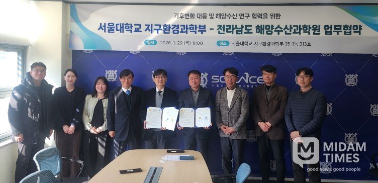 미담타임스 김준완 기자 | 전라남도해양수산과학원(원장 김충남)과 국립대학법인 서울대학교 지구환경과학부(학부장 박록진)는 29일 서울대학교에서 ‘기후변화 대응 지속 가능한 해양수산 연구 체계 구축’을 위한 업무협약(MOU)을 했다.