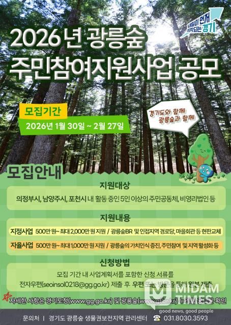 미담타임스 정주환 기자 | 경기도가 광릉숲 생물권보전지역 활성화를 위해 2026년 광릉숲 주민참여지원사업 참여자를 모집한다.