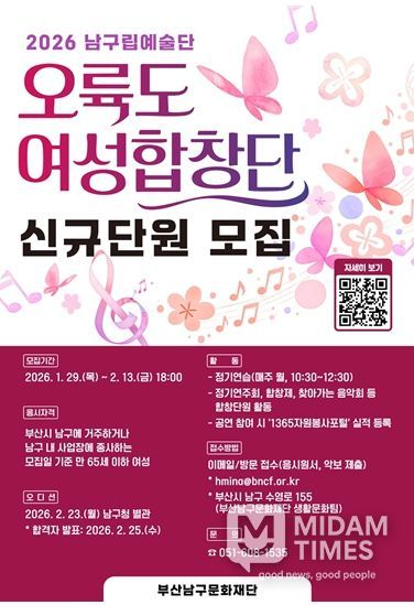 미담타임스 김교환 기자 | (재)부산남구문화재단은 남구립 오륙도여성합창단의 2026년 신규 합창단원을 1월 29일부터 2월 13일까지 공개 모집한다고 밝혔다.