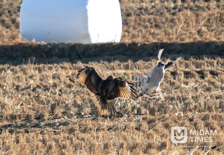 미담타임스 김준완 기자 | 울산시는 지난 1월 16일 오전 11시경 울주군 온양읍 동상리 들녘에서 천연기념물이자, 멸종위기야생생물 Ⅱ급인 참매가 사냥한 먹이를 말똥가리가 차지하는 먹이다툼 장면이 관찰됐다고 밝혔다.