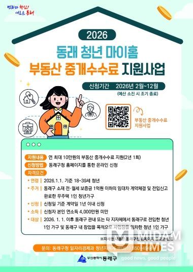 미담타임스 김교환 기자 | 부산 동래구는 청년의 주거 안정을 지원하고 청년 창업을 유도하기 위해 ‘2026년 동래 청년 마이홈 부동산 중개수수료 지원 사업’을 추진한다고 밝혔다. 접수 기간은 12월 10일까지이며, 예산 소진 시 조기 마감된다.