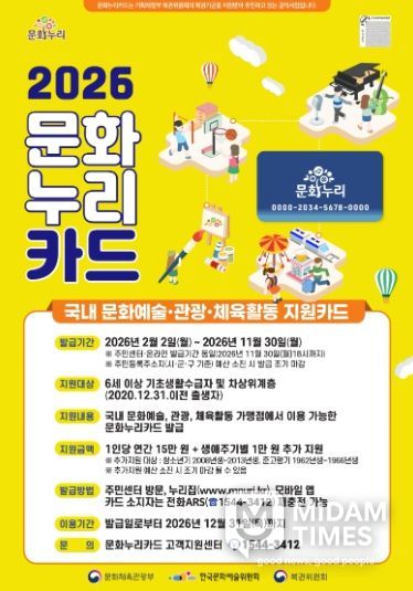 시 관계자는 “문화누리카드 지원 확대를 통해 문화취약계층의 문화 향유 기회가 확대되길 기대한다”며, “앞으로도 생애주기별 맞춤형 정책을 지속적으로 추진하고 홍보하겠다”고 말했다.